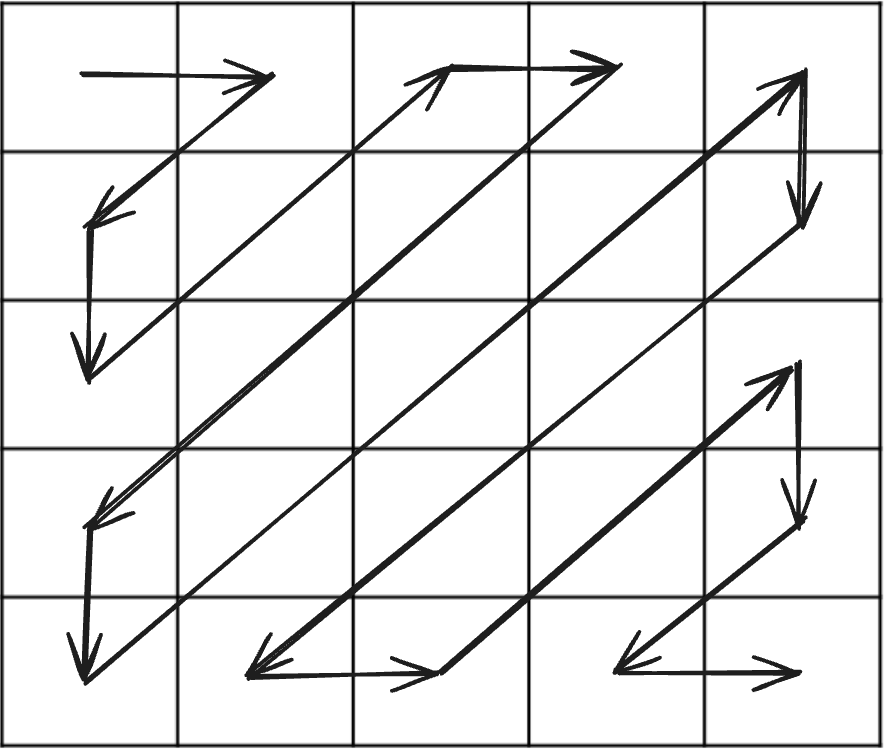 Cho bảng A kích thước ~n×n~ (~n~ dòng, ~n~ cột). Hãy lần lượt điền vào bảng theo sơ đồ sau (với các số ~1, 2, ..., n^2~ được thể hiện theo thứ tự tăng dần).