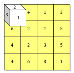 Cho ma trận kích thước ~m×n~ và con xúc xắc nằm ở ô (1, 1). Các mặt của con xúc xắc được ghi một số tự nhiên từ 1 tới 6: Mặt áp xuống lưới mang số 6, mặt hướng về mép trên của lưới mang số 2, mặt hướng về mép trái của lưới mang số 3, tổng 2 số ghi trên 2 mặt đối diện bất kỳ luôn bằng 7 (xem hình vẽ).