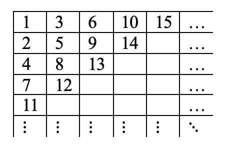 Cho một bảng kích thước vô hạn được chia làm lưới ô vuông đơn vị. Các hàng của bảng được đánh số từ 1 từ trên xuống và các cột của bảng được đánh số từ 1 từ trái qua phải. Ô nằm trên giao điểm của hàng ~i~, và cột ~j~ được gọi là ô ~(i,j)~. Người ta điền các số nguyên liên tiếp bắt đầu từ 1 vào bảng theo quy luật sau: